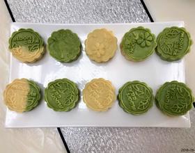 - 7. 炒好的绿豆泥,分2份,一份放入适量的抹茶粉揉均匀。然后捏成一团团,每个大约40g,放入50克的月饼模具中压出形状。