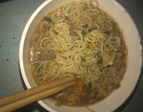 将面饼于热水中静止三分钟,使面条变软,去除表面多余油,倒掉水