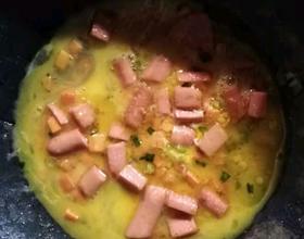 当火温在六成热时放入切好的葱,胡萝卜,火腿肠