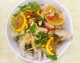 - 5. 在碗中放入柠檬三片 香菜一颗 切好的蒜蓉和小米辣 然后加入两大勺酱油+两大勺醋+一汤匙糖+三分之一汤匙盐+一汤匙香油+一勺汤(煮鸡爪的水)