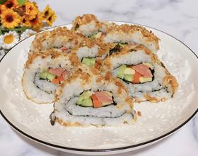 寿司卷的时候避开寿司帘和保鲜膜,然后跟着感觉 边卷边捏紧,稍定型后松开即可