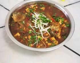 - 15. 捞出鲫鱼装入盆中,剩下的汤汁里面加入青红辣椒,煮一分钟出香味后,勾薄芡,淋入盆中。
