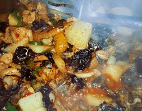 配一碗香喷喷的大米饭,浇点汤汁,简直不要太美味,麻辣爽口,还有些甜味,土豆块炖的软糯,山药脆脆的,,木耳带着汤汁美味,要是有些金针菇就更好,但是跟外面卖的好像味道不很一样。不影响,我姐吃到最后还在汤里挑碎肉肉咂摸嘴。哈哈