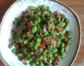 下油炒豆,放适量清水,至豆子快熟的时候把肉末放一起翻炒