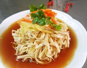姜丝要切得比干丝要更细。白干丝随切随放入装满的水的碗中,不要粘在一起。