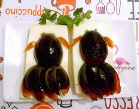把皮蛋摆在豆腐上面,完整的一半做金鱼头,小片做尾巴