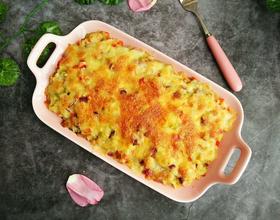 - 7. 盛入烤碗,铺整齐,撒上芝士碎