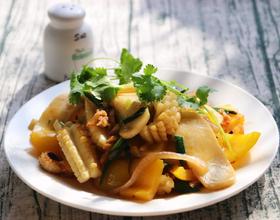 五花肉切细丝,黄椒切小块,墨鱼切长块,表面拉井字花纹。