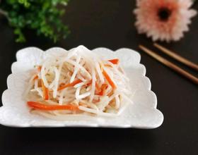 鸡胸肉切时逆着鸡肉纹理切,这样炒时才嫩。豆芽菜热水烫过后,要控干水分,以免炒时出水。炒时不加酱油,保持豆芽本色。