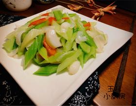 西芹、红椒斜切成菱形。(太粗的西芹先对剖再斜切)