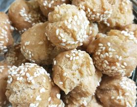 - 6. 再将面团分几个小面团,再将小面团揉成木棍状,再揪小挤子,沾上芝麻,为了不让芝麻脱落,手上沾点水再拿小挤子去沾芝麻,如图,