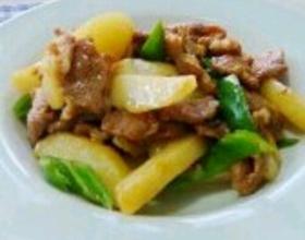 有烧至八成热把肉倒入锅中加盐、味达美翻炒,翻炒肉九成熟把蒜瓣、青尖椒倒锅中翻炒