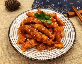- 6. 待油温升高至九成热,在下入里脊肉复炸至金黄色酥脆捞出。