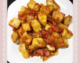 - 7. 将配菜与馒头块炒在一起,所有食材翻炒均匀。