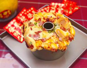 方子是8寸的,我拿了个7寸中空模,过年嘛,想做出盆满钵满,满出来的感觉。你可以8寸模具随意放置小面团。先放随意的一层面团。