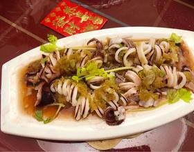 - 1. 鱿鱼洗净切好,不把鱿鱼身切断,留一些带着。用一勺盐,一勺淀粉,料酒腌片刻。