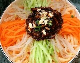 面条装碗里少加汤放黄瓜丝胡萝卜丝豆芽最后把炸好的酱舀一大勺放上面调拌均匀食用
