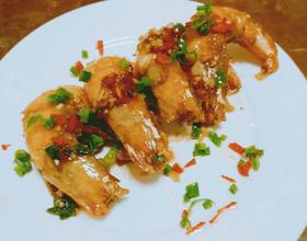 - 5. 热锅倒入两汤勺油把姜粒,蒜粒,葱白粒,红椒粒下入锅中爆香跟着把炸好的虾倒入翻炒,烹入用黄酒,鱼露,头抽,白糖调好的汁翻炒至水份干铲起摆碟撒上葱花。