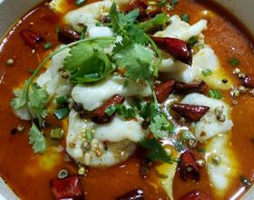 - 6. 鱼片上边撒点姜蒜末,锅洗净加适量油烧热,加入干青花椒干红椒爆香后浇在鱼片上边,加小香菜装饰即可上桌