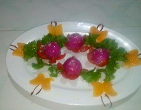 1,桔子摆成,像蝴蝶,我用苹果皮剪个触角。2,也可淋,沙拉酱,酸奶,依个人口味。