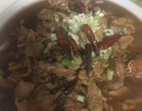 热油放葱姜蒜,放郫县豆瓣,再放火锅底料,放糖、放水,烧开把底料渣捞出去,撒上腌好肉片!煮一分钟,到入配菜里。