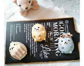用黑色剪出鼻子粘在白色上面,用粉色做腮红,用适量蓝色搓四个月做胳膊和腿粘在上面,第三个造型完成,发酵好,上锅蒸12分钟,等三分钟接锅。