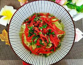 然后抓出腌出的水并控掉,上面铺上红椒丝,撒上一点葱花。