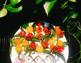 - 9. 把蒜苗叶切成条点缀一下,沙糖桔叶子打底,把培根玫瑰花和砂糖桔随意摆放,一个充满新意的玫瑰花培根早餐就完成了。