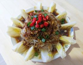 - 11. 焯好的娃娃菜控干水,摆入盘子上,粉丝放上面,把调好的蒜浇在上面
