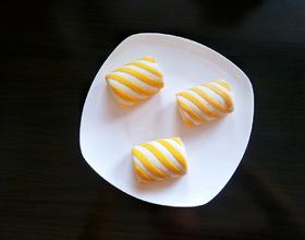 - 2. 分别把面团擀成长圆,黄色面均匀的切成细条。