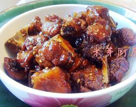 汤汁开始变浓后,转大火收汁,不停翻炒直至浓汁浓稠均匀裹在排骨上即可。