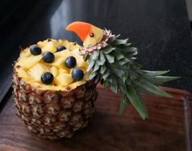 - 15. 鹦鹉肚子底下扎上牙签,再扎到菠萝上就完成了。