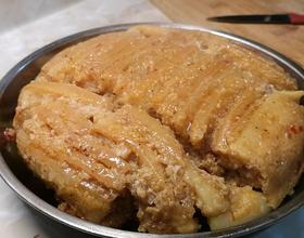 - 7. 蒸好的肉待盘子不烫的时候,找一个大盘子盖住再翻转过来,也就是扣肉的方法