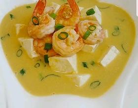 准备虾仁去虾线,豆腐切小块,蛋黄蒸熟切碎