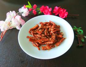 - 10. 放入辣椒粉,白白芝麻快速翻炒,倒入炸好的肉条,鸡精翻炒均匀即可出锅。