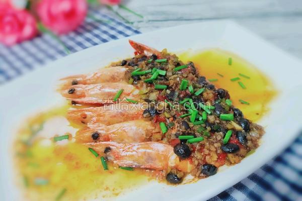 6.将炒好的蒜蓉豆豉浇在虾身上。
