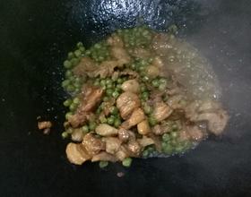 把五花肉炒成金黄,放豌豆粒,放水(过面即可)放姜、盐、生抽、耗油,盖锅盖大火煮