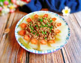 这道菜比较清淡,肉末里盐要适量放,不能太咸。肉沫不用炒太久,因为还要蒸,变色即可。也可以搭配火腿一起蒸。