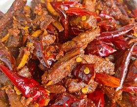 - 7. 这时将事先准备的辣椒,花椒,桂皮,八角放入油锅中炒,再将炸好的牛肉条放入