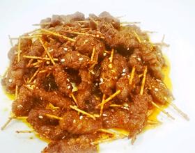 炒制外焦黄捞出锅,美味的香辣牙签牛肉就做好了