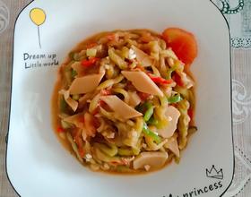锅放油7成热 放葱姜 茄丝 青红椒丝