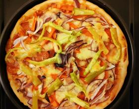 - 3. 菜准备好后,面差不多也发酵好了。我用的是八英寸的披萨盘,在盘底刷一层薄薄的油,先将面团揉几下,然后把面团擀成圆饼,放到披萨盘上,边缘捏起,用牙签在上面扎眼