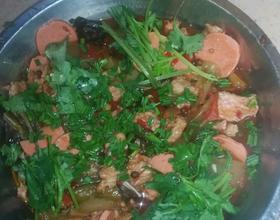 - 12. 之后倒入火腿肠,煮一分钟后再倒入上海青和金针菇
