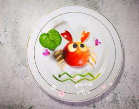 苹果切二瓣,一半做螃蟹身体 ,另外一半做成二个螃蟹钳子和八条腿