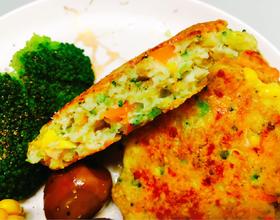 - 9. 锅内放少许油,将和好的蔬菜肉泥放入锅内,压成圆形,两面煎成金黄即可