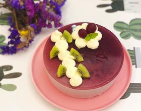 把慕斯蛋糕从冰箱取出,把蓝莓水倒入蛋糕上面。