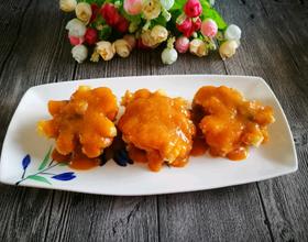 将炒好的果酱汁,淋在鱼菊花上面。成品。