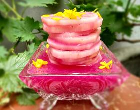 盆倒入莲藕片,白糖和火龙果汁,腌制八个小时。