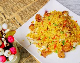 装盘。香喷喷的烧汁鱼柳炒饭做好了。