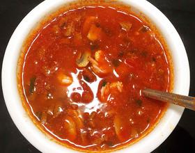 下白蘑菇、牛肉丸碎炒一下、下西红柿喜欢吃酸可以加点番茄酱